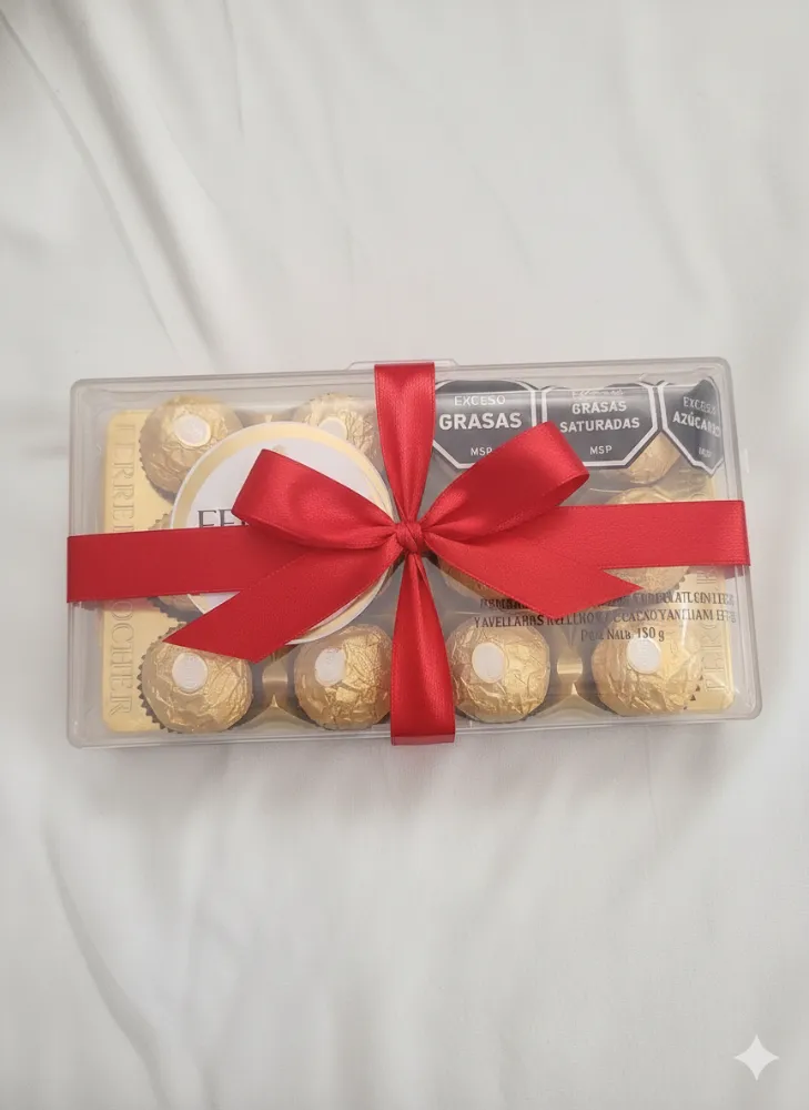Caja de acrílico con 12 bombones Ferrero, un clásico.